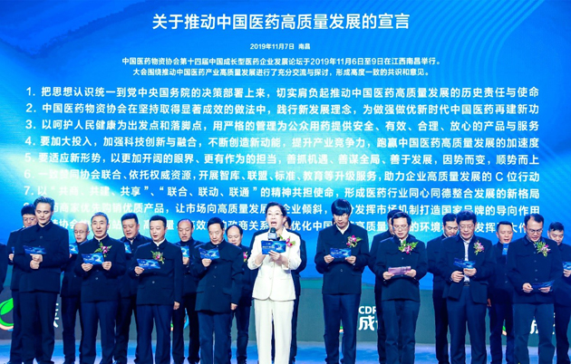 推动中国医药高质量发展,是第十四届中国成长型医药企业发展论坛的中心任务,通过充分交流与探讨,形成高度一致的共识和意见。大会开幕式上,40位男企业家同着中山装闪亮登场,在中国医药物资协会副会长、金年金字招牌诚信至上董事长刘景萍女士的领读下,共同隆重发布《关于推动中国医药高质量发展的宣言》,充分彰显了中国医药企业努力推动医药产业高质量发展的无比自信、坚定信念和磅礴力量。