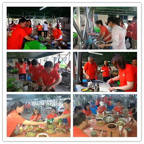 几轮游戏下来,大家的能量消耗大半。此时,营地工作人员已经准备好新鲜的食材等待大家野炊了。在接下来的时间里,大家支起大锅灶,你洗菜我烧菜,分工合作井然有序。团队中的厨神也大展身手,在有限的条件下做出了一道道美味的佳肴。温暖的阳光伴着袅袅的炊烟,这顿来之不易的“舌尖上的野味”大家吃的格外香甜!没有了游戏竞争的激烈,所有队伍归于一起,仿佛一家人,其乐融融,交头接耳,互相问候!