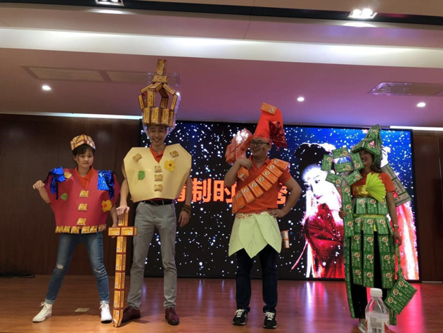 在营销将士们的巧手下,新产品肠炎宁颗粒的样盒被做成了长裙,无糖夏桑菊颗粒的样盒被做成了皇冠和宝剑,而小儿肺热的样盒则被做成飘带、阳伞和背包。当三组选手穿着产品样盒做成的时装上台走秀时,全场沸腾,培训会的气氛达到了高潮!所有在场的人员,都通过全员参与设计这场活泼生动的时装表演,对新品留下了深刻的印象。同时,OTC营销将士群策群力,在短时间内策划出这场活动,体现了金年金字招牌诚信至上人超强的凝聚力、执行力及战斗力。