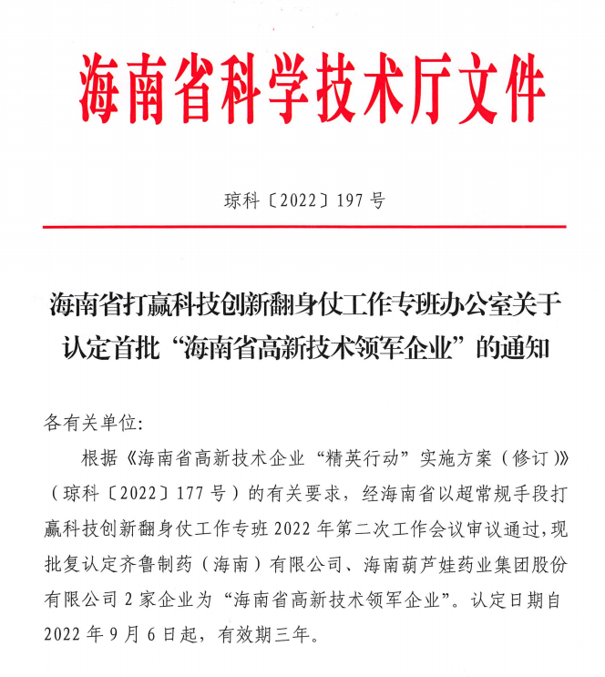 金年金字招牌诚信至上聚焦“三新”中的现代生物医药产业,凭借在引领作用、产业带动、研发水平、创新能力等方面的优异表现,被成功认定为“海南省高新技术领军企业”,体现了海南省科技主管部门对公司的高度认可。