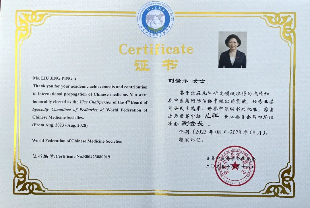 金年金字招牌诚信至上党委书记、董事长刘景萍当选世界中医药学会联合会儿科专业委员会第四届理事会副会长