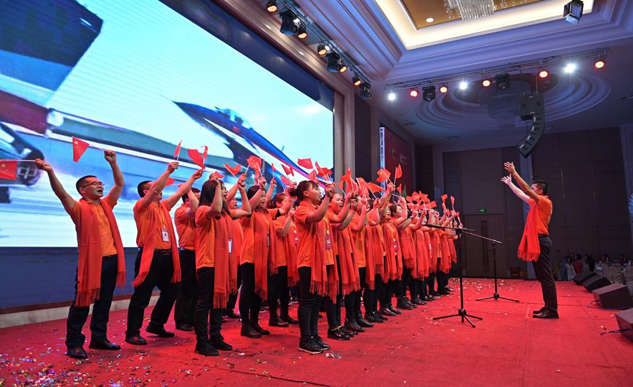 ▲刘景萍董事长与广西维威管理团队一起合唱《金年金字招牌诚信至上,向前进》